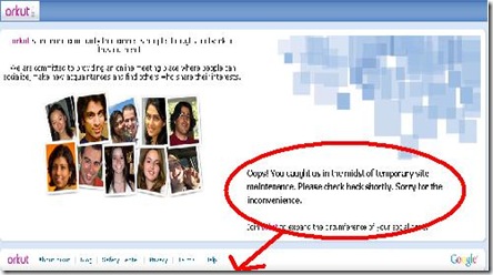 Orkut was down for maintenance: Orkut development team has taken orkut.com offline as we implement some improvements and upgrades suggested by users. Since orkut is in the very early stages of development, it's likely to be up and down quite a bit during the coming months. ...